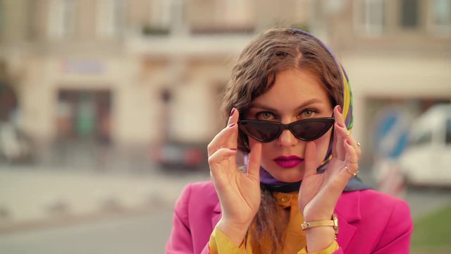 Fashion model wearing black cat eye sunglasses, kerchief, colorful clothes, looking at camera, removing glasses, posing in street of european city