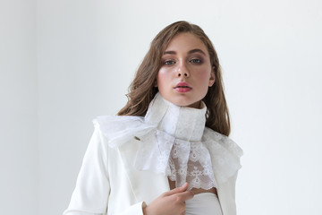 Portrait of a beautiful woman with a bright unusual makeup and a white jabot around her neck. The queen's clown costume.