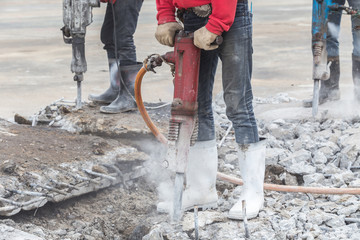 Builder worker with pneumatic hammer drill equipment breaking concrete at road construction site