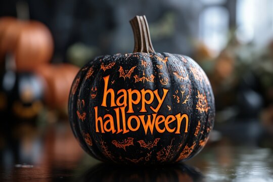 Halloween jack o lantern pumpkin with carved bold text "happy halloween" , A warm and mysterious Happy Halloween Jack O Lantern Pumpkin. black background