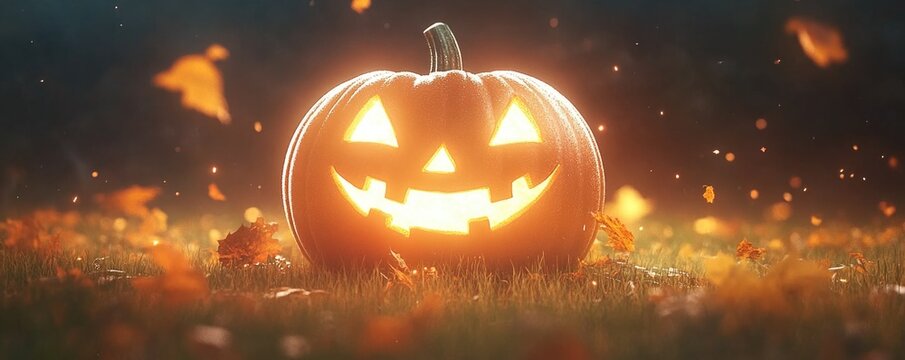 Glowing pumpkin with jack-o'-lantern face amidst falling autumn leaves on a misty evening