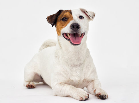 Portrait of small cute dog, Jack Russell Terrier puppy calmply sitting, posing isolated over white studio background