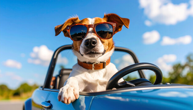 A Jack Russell Terrier dog wears sunglasses and drives a blue convertible car on a sunny day.
