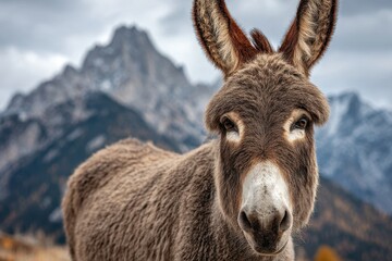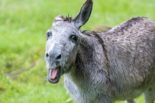 close-up portrait of a lone small brown donkey peacefully grazing on the grass