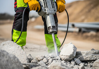 A construction worker using a jackhammer to break concrete, highlighting the physical labor and equipment involved in demolition and road repair, showcasing the power and precision of the tool