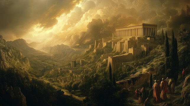 Illustration of Jacob and his family walking in the streets of Egypt Generative AI