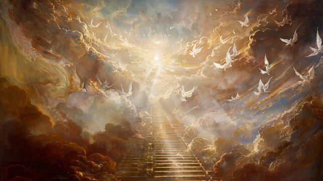 Jacobs Ladder reaching to the sky, ethereal light shining through the steps, creating a mystical and divine atmosphere, perfect for celestial and fantasy art