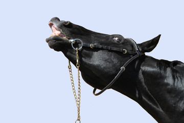 Stallion catches the mare's pheromones from the air. Flehmen reflex. The horse's muzzle and teeth. Jacobson's organ