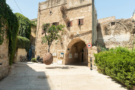 Old Jaffa Tel Aviv, Israel. City view and sight. Famous suspended orange tree. Sightseeing and tourism in Israel, Middle East.
