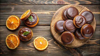 Chocolate jaffa cakes with orange marmalade on wooden background top view