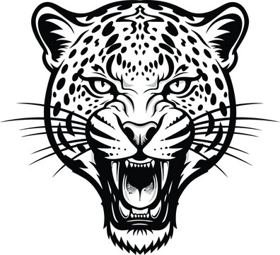 A ferocious jaguar head roars with its sharp teeth showing, isolated on white background