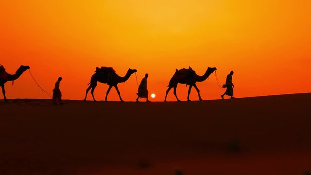 Indian cameleers camel drivers bedouin with camel silhouettes in sand dunes of Thar desert on sunset. Caravan in Rajasthan travel tourism background safari adventure. Jaisalmer, Rajasthan, India
