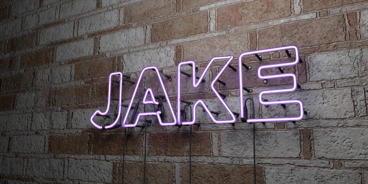 JAKE - Glowing Neon Sign on stonework wall - 3D rendered royalty free stock illustration.  Can be used for online banner ads and direct mailers..