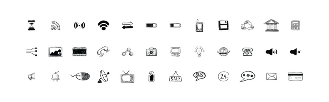 Collection of various electronic devices and office supplies in a simple line art style design icon set. Set of Hand Drawn Telephone and Smartphone Icon Collection. EPS, vector illustration.