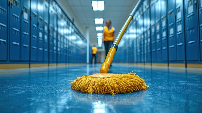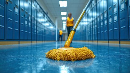 Janitorial staff mopping a school hallway with blue lockers in the background. Cleaners at work maintaining cleanliness and hygiene in a school building.