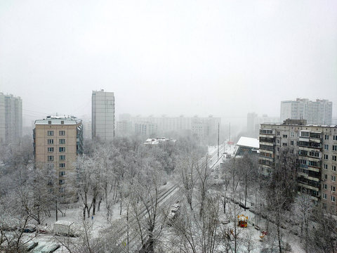 Moscow, Russia - January 11, 2020: View to residential area during snowfall