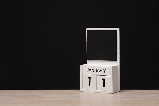 White wooden block monthly calendar with the date january 11 on the table, black blackbackground. Planning