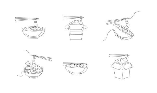 set One continuous line drawing Japanese spicy noodles banner logo flyer Fast food cafe shop logotype template concept Modern single line draw design vector illustration
