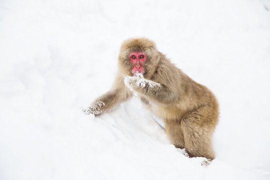 animals, nature and wildlife concept - japanese macaque searching and eating food in snow at jigokudan monkey park