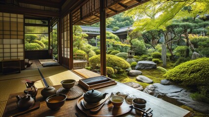 Traditional Japanese tea ceremony in a peaceful garden setting