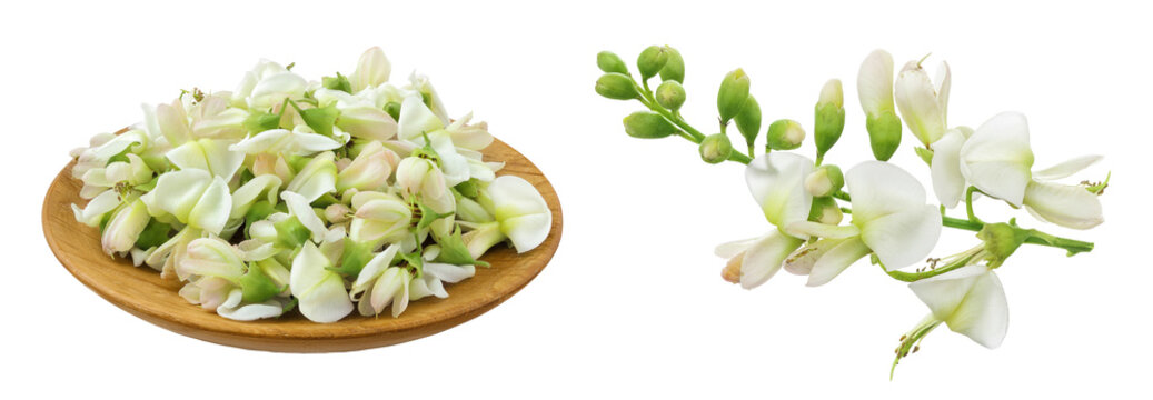 flowers of Sophora japonica or Styphnolobium japonicum in wooden bowl isolated on white background