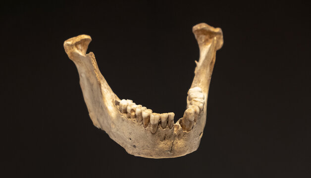 Antique human jawbone specimen on a dark background, indicative of archaeological interest or museum exhibition. Neanderthal bones have been found in Malaga in the Cave of Boquete de Zafarraya