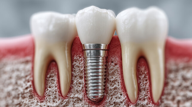 Dental implant with crown between natural teeth in jawbone cross section, showing detailed gum and bone structure, symbolizing oral health and dental restoration