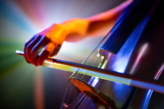 Detailed photo of classical cello with bow in colorful vibrant stage light casting vibrant shadows. Solo performance. Concept of hobby and work, music festivals, concerts, symphony show, culture.