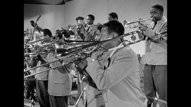 WIDE People dancing during concert of a modern jazz band playing on a stage of a small crowded venue. Shot with 2x anamorphic lens