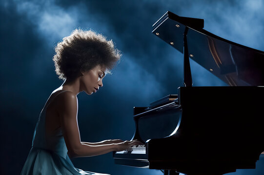 Soulful Serenade: A Talented Pianist with an Afro Weaves Magic on Stage with Blues and Jazz, ai generative