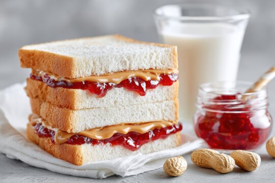 Peanut butter and jelly sandwich resting on white napkin with glass of milk and peanuts