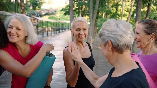 Group of happy senior women saying goodbye after sport training outdoors, giving high fives and hugging, tracking shot
