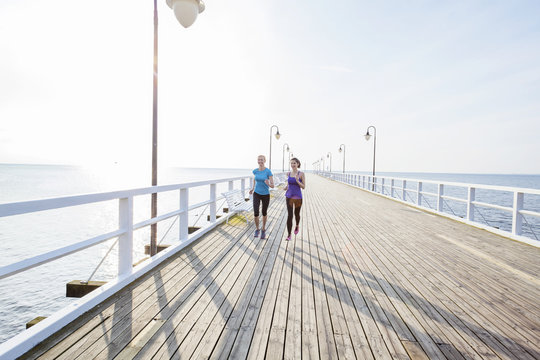 Two women jogging along a jetty