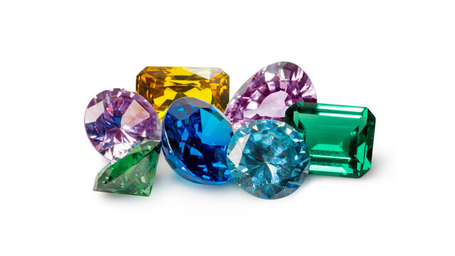 Set of vector realistic turquoise, black, purple, orange gems and jewels on white background. Multicolor shiny diamonds with different cuts. Design elements and icons for holiday gift and jewelry shop