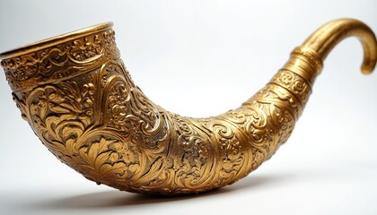 Ornate golden shofar horn on white background. Detailed ceremonial object for Jewish holidays. Sacred musical instrument shows intricate patterns, traditional art. Represents faith, ancient culture,
