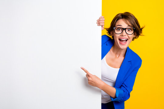 Photo of impressed funky lady dressed blue blazer eyewear pointing white wall placard empty space isolated yellow color background