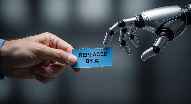 AI Automation Replacing Human Labor Concept: Human Hand Holding 'Replaced by AI' Note with Robot Hand, Illustrating Job Displacement and Future Tech