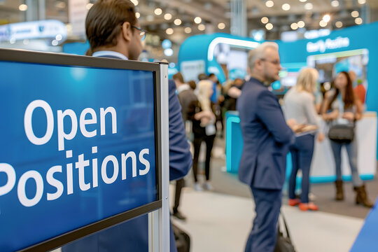 A professional image of a recruitment desk at a job fair with "Open Positions" displayed on a digital screen