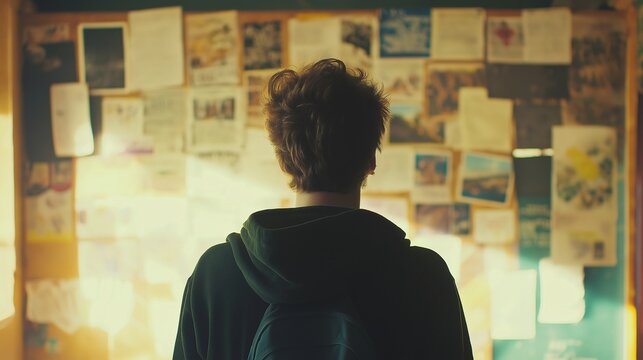 Person standing in front of a job listings board, scanning opportunities with a focused expression. The scene conveys the pursuit of career advancement and the search for meaningful employment.