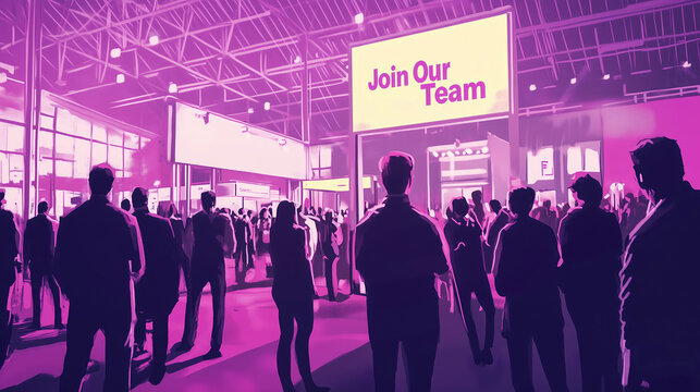 Silhouettes of people at job fair or recruitment event with large illuminated sign displaying the message "Join Our Team" in pink and purple color scheme