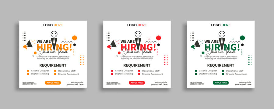Hiring job vacancy post banner template set. Business we are hiring employee square flyer design.