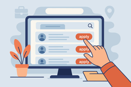 Job search online concept. Hand of a candidate clicks the apply button on a computer screen. Recruitment website with job vacancies list. Human resources, career, employment.