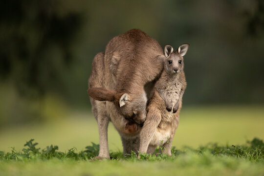 Preparing to Explore - During the early morning, a young joey hops out of her mother’s pouch to stretch her legs.