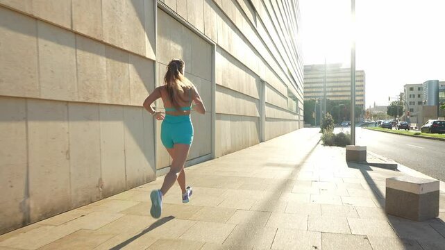 A woman jogs through a park at sunrise, surrounded by trees and a city skyline