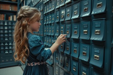 Young girl in a library looks through a card catalog drawer