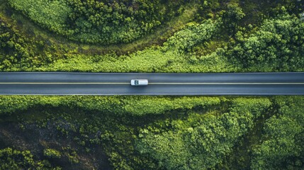 panoramic road trip concept, segmented landscape photography, multiple ecosystems joined by continuous asphalt strip, vehicles on road for scale, high-contrast nature scenes