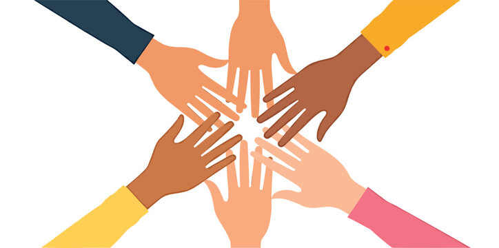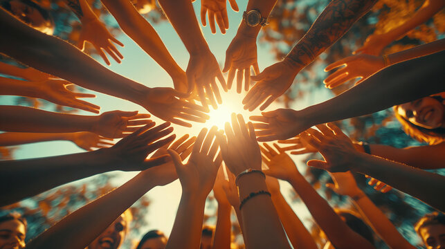 Diverse group of people are joining hands in unity, symbolizing teamwork and support