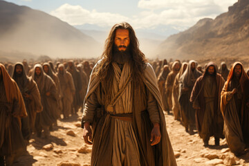 Illustration of Joshua leading the people of Israel in the desert on the way to Canaan Generative AI