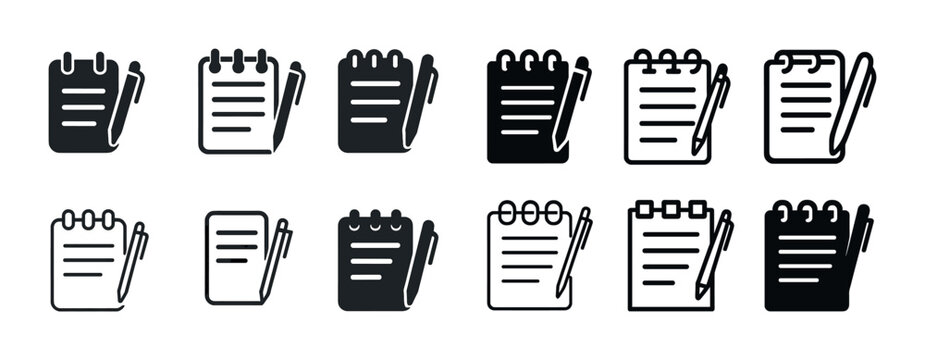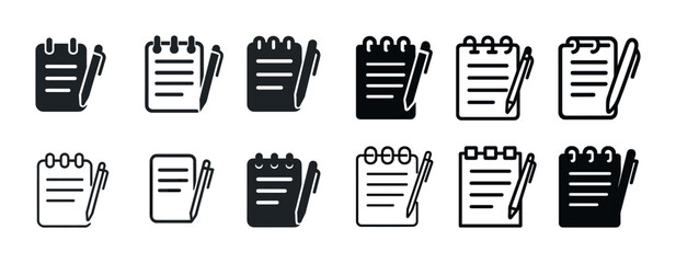 Set of notepad and pen icons in various styles