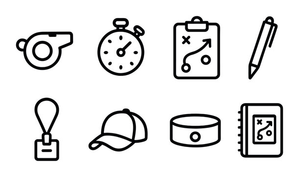 Sports coaching icons: whistle, stopwatch, strategy board, pen